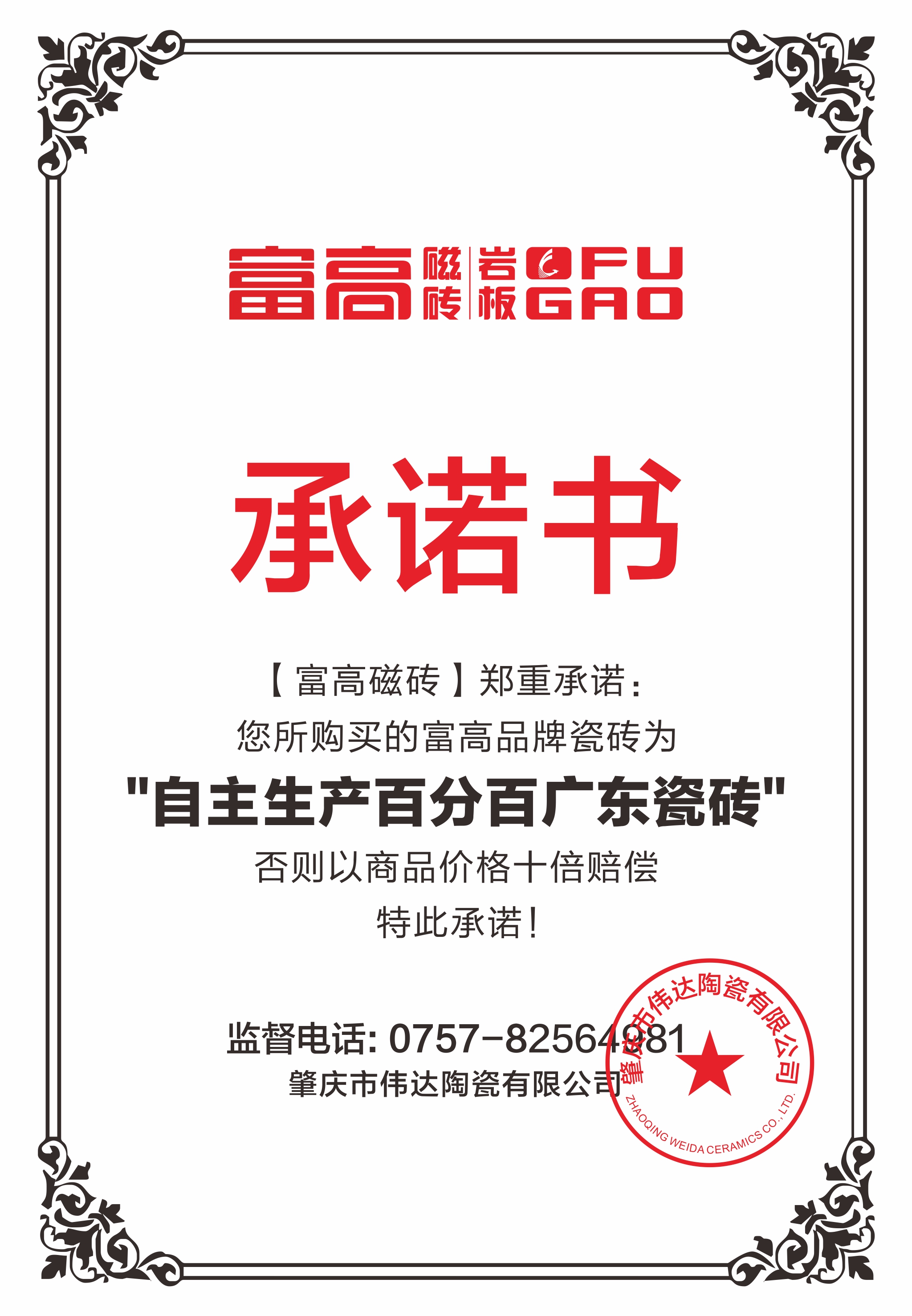 自主生产百分百广东瓷砖承诺书