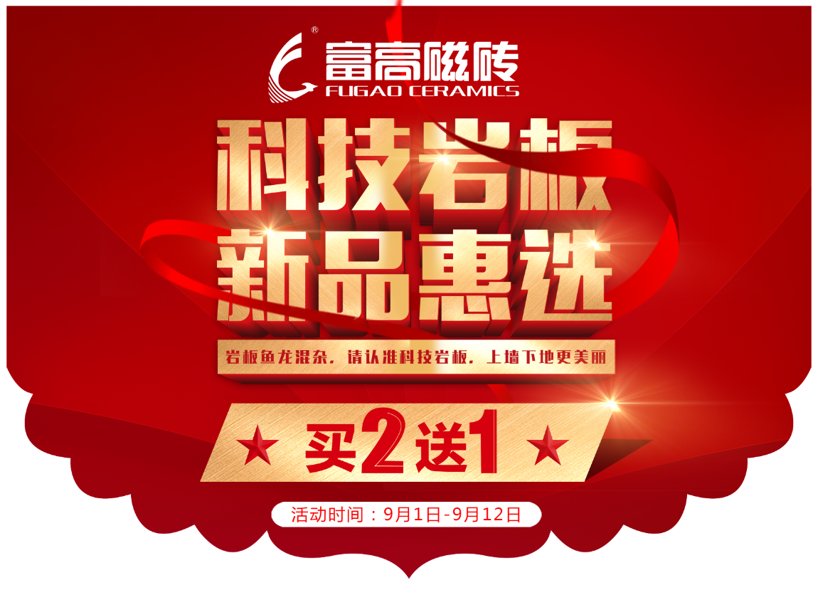 9月1日-12日,富高磁砖倾情特惠“科技岩板•新品惠选”,数百款特供爆品“科技岩板”,买2片送1片、超值体验,您不容错过喔!