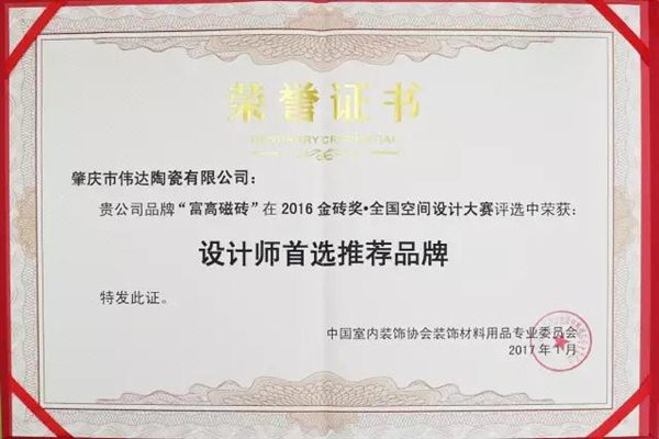 此次评选活动是中国室内装饰协会装饰材料用品专业委员会、广东设计师联盟、华夏陶瓷网联合主办,由华夏时代传媒、广东设计师联盟(佛山)、行业媒体及行业资深人士组成的专家组委会,颁发给2016年度建陶领域表现卓越的陶瓷品牌。此次富高磁砖获得“2017年中国设计师首选推荐品牌”荣誉称号,可谓实至名归。