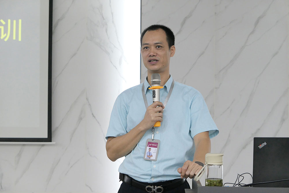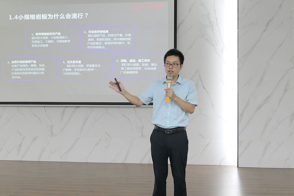 会议后半部分是由集团销售总经理李达仁为大家带来《如何做好推广》的课题分享。李总先为大家介绍集团对小岩板规格、厚度等方面的具体规划部署,并指出小岩板施工易、易搬运、成本低、破损率低等优势。