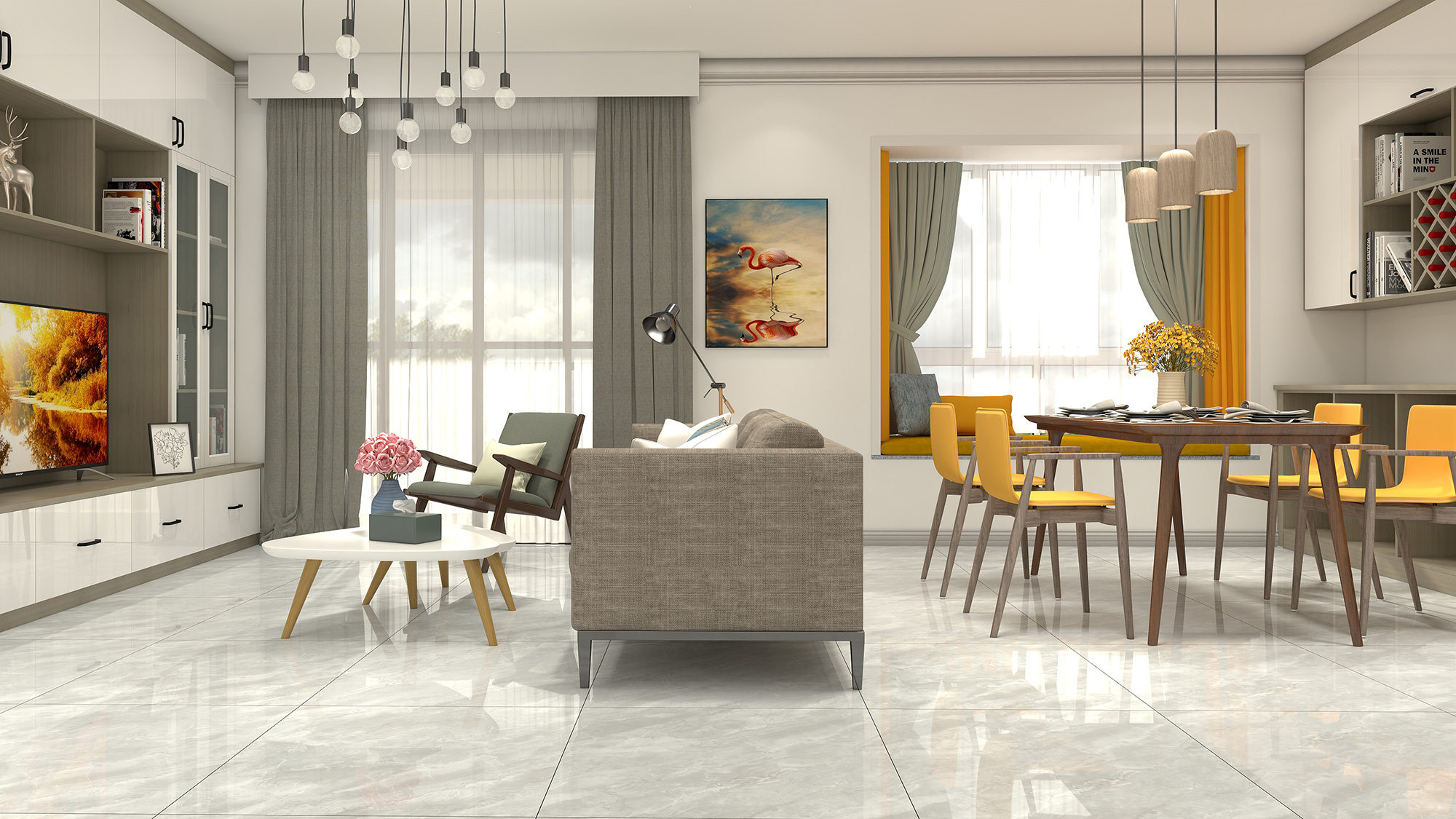 用一张沙发来划分客厅与餐厅,加强了空间整体的功能性,地面采用了高迪灰,联袂灰色和黄色,共同打造宽敞的明亮家居。