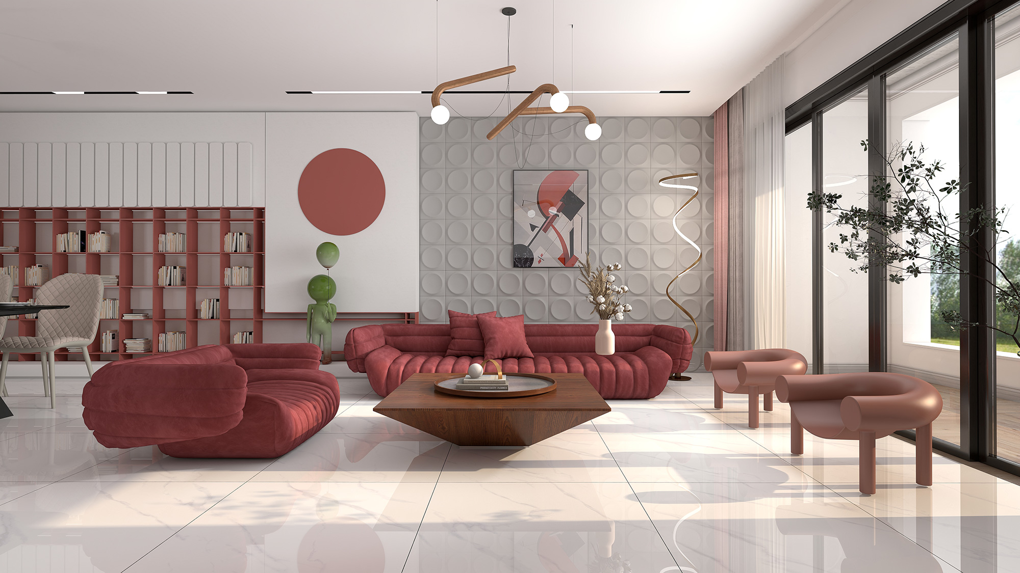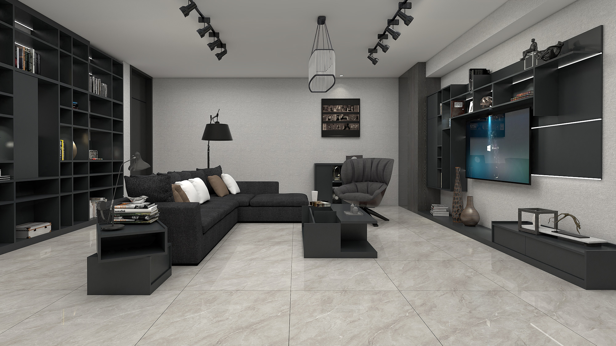 由西西里灰铺设的空间,充满轻奢的气质。黑、白、灰的组合,仿佛是一次流行与复古的对话,穿越了时间与空间。