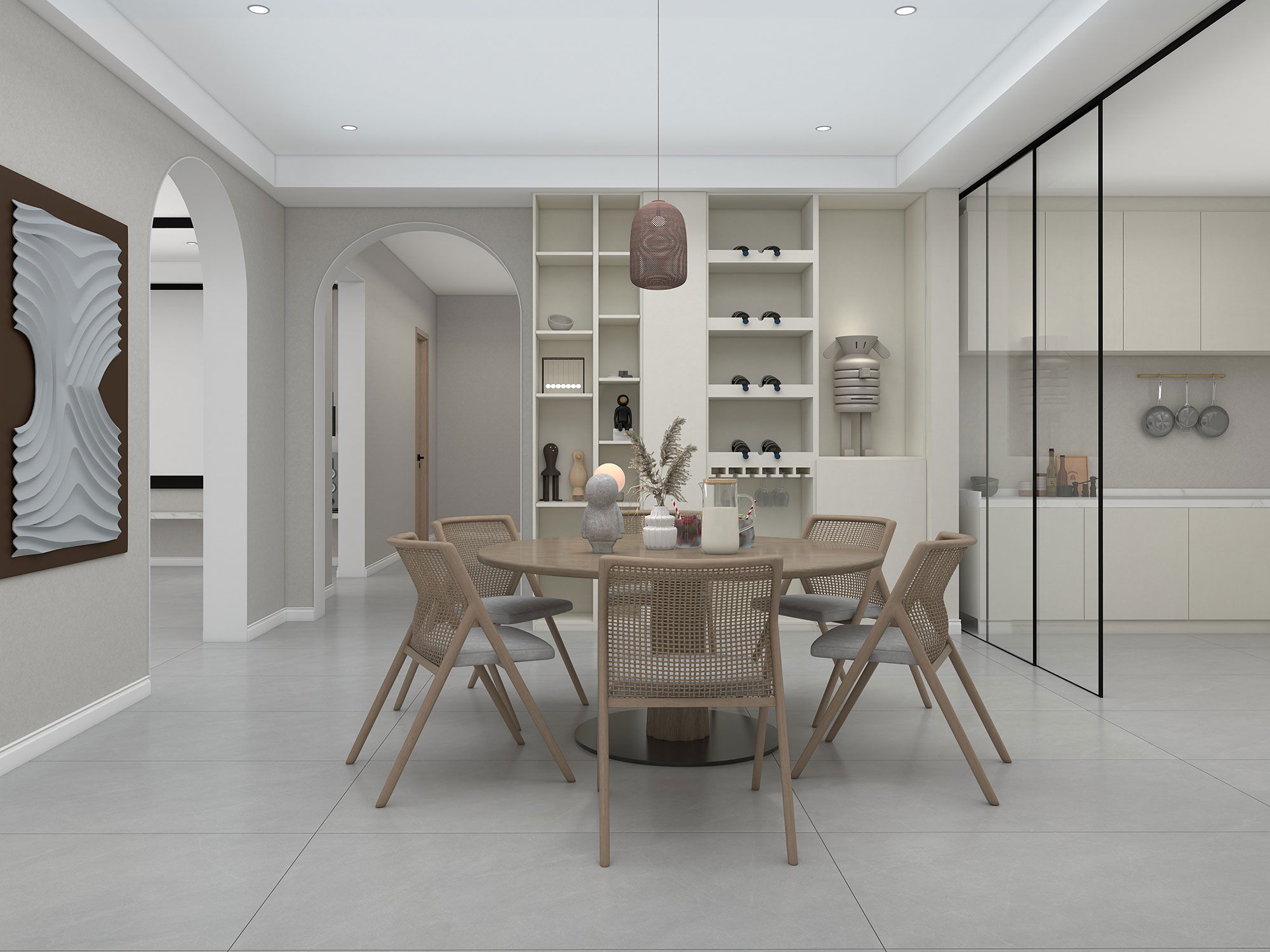 浅色系木质餐桌椅,时尚精致的吊灯,白色的墙柜,设计感十足的挂画……在海角天涯的主导下,整个空间简约大方,充满活泼的气氛。